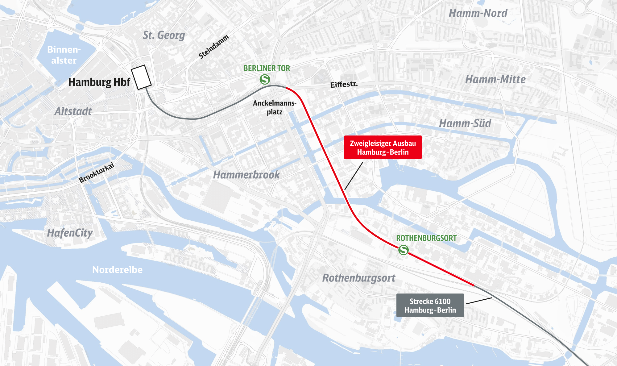 Die Bahnstrecke zwischen Hamburg und Berlin wird ausgebaut. Der Bund hat die DB InfraGO AG damit beauftragt, dort eine durchgängige Zweigleisigkeit herzustellen. Dafür wird der zurzeit eingleisige Abschnitt zwischen Rothenburgsort und Anckelmannsplatz um ein zusätzliches Gleis erweitert. Das schafft mehr Kapazitäten im Fernverkehr Richtung Berlin und auch im Regionalverkehr von Hamburg nach Büchen, Schwerin und Rostock.